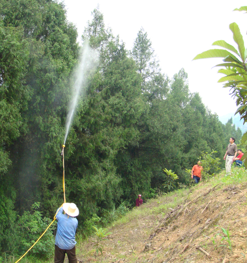 2015年6月10日,三台喷雾机同时在长江岸边的巴东县巴山林场的柏树林内响起,巴东县2015年的鞭角华扁叶蜂的防治工作正在紧张进行。